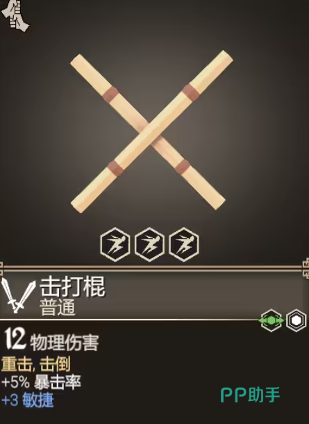 对于偏好棍法风格的玩家来说,击打棍是一个可选方案。其物理伤害为12点,支持重击机制,但暴击增益仅有5%,并附加3点敏捷提升。相比其他双手武器,整体输出成长偏低,建议更倾向于选择斧或锤类以获得更高收益。