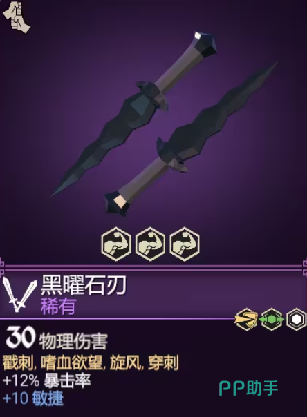 若追求更高稀有度装备,黑曜石刃值得推荐。这是一把紫色稀有级别的武器,基础物理伤害高达30点,处于当前武器梯队顶端。其旋风穿刺效果强于蓝色品质同类,暴击率直接提升12%,敏捷属性一次性增加10点,全面强化角色作战能力,是高阶玩家的理想选择。