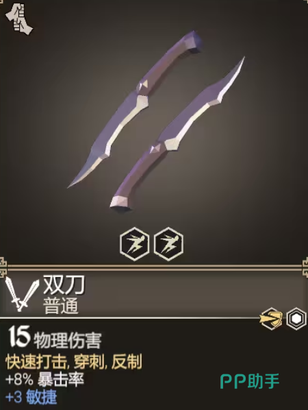 双刀类武器的基础伤害为15点,高于击打棍,具备快速打击特性,能够有效提高攻击频率。在输出过程中可触发穿刺与反制压制效果,暴击率提升达8%,敏捷增加3点,虽属性增幅有限,但对于刺客型角色而言已能满足基本需求。