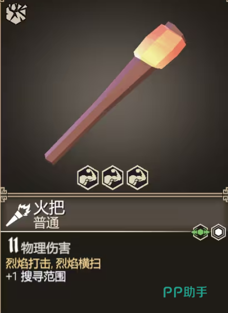 首推的是火把,作为基础品质的近战工具,它主要造成物能伤害,并附带烈焰打击与横扫两种特殊效果。装备后还能使角色的探索范围扩展一格,在早期探索地图时具备一定的战术优势。