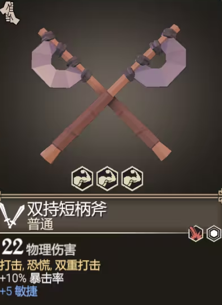 另一款值得关注的双手武器是双持短兵斧,虽为白色普通品质,却拥有高达22点的物理伤害输出。除了基础打击外,还可施加恐慌状态给敌人,形成心理压制。同时提供10%暴击率提升以及5点敏捷属性加成,综合性能出色,推荐优先考虑用于双手流派的角色搭配。