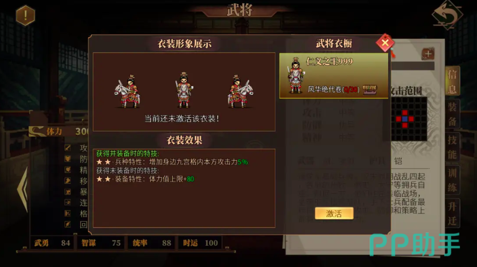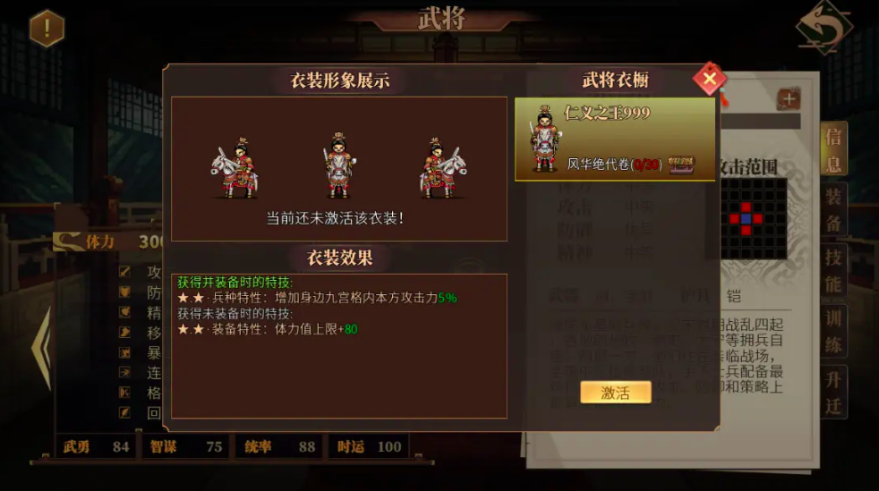 在角色养成的过程中,时装也是分不开的,兵种衣橱、武将衣橱,不再只是外观提升的花瓶,而是真的能够为武将、兵种带来附加值。每个角色都有自己的专属时装,在成功激活后,可对技能以及装备特性进行强化,所以在兵种武将养成上,一定要快速解锁专属时装。可增加身边九宫格内所有兵种5%的攻击力,且武将本身的体力上限可增加80。