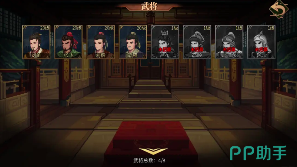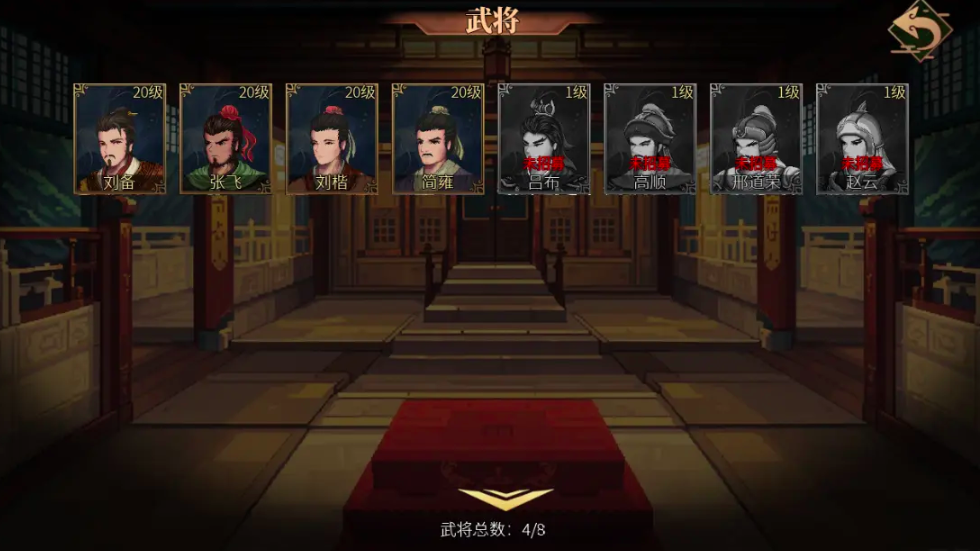 其实在角色养成上还是非常简单的,目前游戏设计了刘备、张飞、赵云、吕布、高顺等8名武将。这些武将角色在基础属性上分为六类,分别是体力,策略,勇武,智谋,统帅,时运。体力常常和生命值挂钩;策略与技能挂钩,通过消耗策略可释放技能;勇武与攻击相关;智谋与精神相关;统帅与防御相关;使用和buff相关。