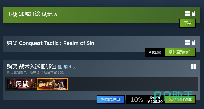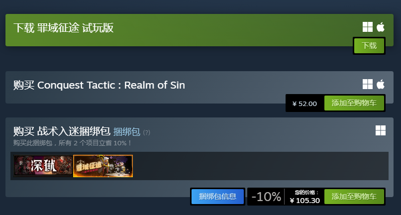 根据Steam平台当前公开信息,《罪域征途》标准版售价为52元,暂未开启任何折扣活动。另提供“罪域征途+深狱”双游捆绑包,定价105.30元,相较单独购买两作合计节省约10%。若玩家对同类型战棋作品有持续兴趣,该捆绑方案更具成本优势。此外,Steam平台已上线免费试玩版本,支持完整首章流程体验,便于玩家在实际操作中评估游戏节奏、操作逻辑与美术风格是否契合自身偏好。