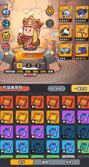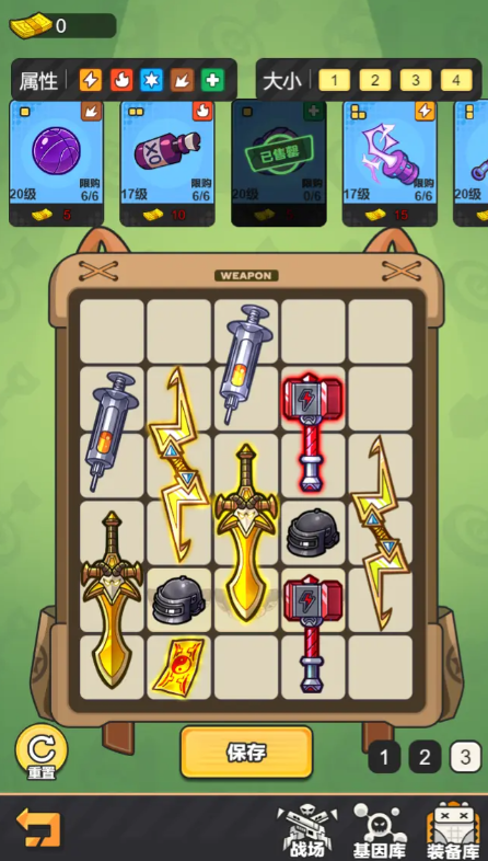 最适合新手玩家使用的高效率推图阵容,其中包含有核心装备雷符、篮球、激光棒、冲锋枪、雷锤、闪电矛、火箭筒、卡车,该阵容的最大优势是,整体的资源消耗概率非常之小,同时,成型的周期极短,比较适合进行前期和中期的关卡挑战,并且,小怪的爆发期,有着很强的清除效应。