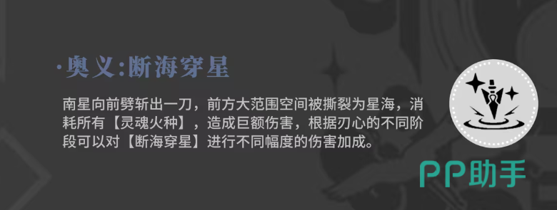 南星的大招为前冲式强力劈砍,释放后会在前方撕裂空间,形成名为“星海”的领域。施放时将消耗全部灵魂火种,对范围内所有敌人造成巨额范围伤害。此外,根据“刃心”所处阶段的不同,该技能还可进一步强化“断海穿星”的伤害数值,实现阶段性战力跃升。