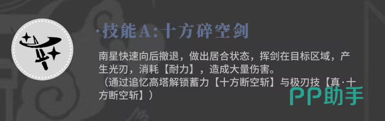 技能一为“十方碎空剑”,释放时南星会迅速后撤进入“聚合”状态——这是她独有的机制。在此状态下,她的剑气可覆盖一定范围,挥剑即可释放出强力光刃攻击,虽然消耗耐力较高,但造成的伤害也非常可观。通过追忆高塔的挑战,玩家可以解锁该技能的蓄力形态“十方断空斩”,从而获得更高的输出爆发能力。