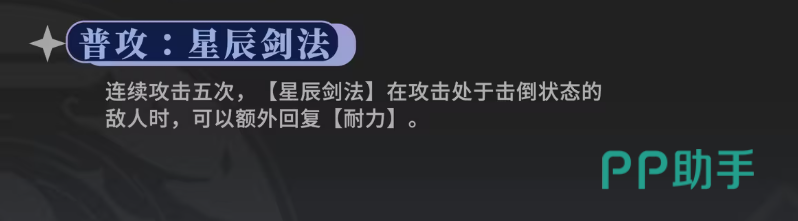 南星的战斗风格以剑技为核心,普通攻击可连续进行五次挥砍,技能名为“星辰剑法”。当敌人处于倒地状态时,使用该普攻不仅能打出流畅连击,还能恢复较多耐力值。她的魂技“星辰变”具备强化效果,依据基础攻击力提升后续第二段与第三段伤害,并可在敌方倒地时触发弱点打击,进一步提升耐力回复效率,增强持续作战能力。