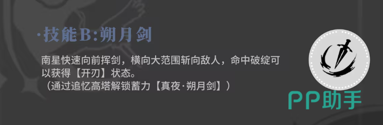 技能二名为“朔月剑”,释放时向前方发动横扫斩击,具有较广的判定范围。命中敌人破绽部位后,可积累“开刃”状态,为后续技能衔接提供优势。同样地,该技能的蓄力版本也需通过追忆高塔逐步解锁,提升等级后能显著增强实战表现。技能三“流星斩”则让南星跃至空中向下劈砍,形成一道强烈的光刃冲击,耐力消耗越多,伤害越高,适合在高资源状态下打出极限输出。