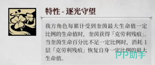 奎茵的攻击方式有些特别,她手持伞具,每一次挥动都能精准地击中敌人,同时造成不小的伤害。她的特性“逐光守望”也显得相当独特。在战斗中,每当队友的生命值丢失到一定比例时,奎茵便会获得一层“克劳利残痕”。这些残痕在特定情况下会被消耗,帮助她恢复一定的生命值。这种机制让她不仅仅是一个输出角色,更具备了强大的生存能力。