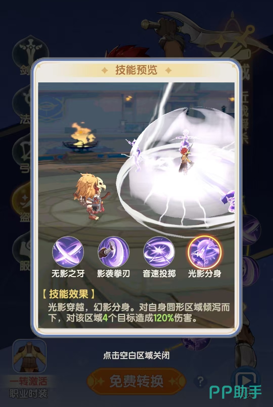 盗贼拥有四个主动技能,具备较强的输出能力与机动性。第一个技能为直线冲刺攻击,能对路径上的最多三名敌人造成75%的伤害,冷却时间为6秒,适合快速突进并打击目标。第二个技能作用范围为矩形区域,同样可命中三个单位,造成75%伤害,冷却8秒,适用于中距离范围输出。第三个技能是以自身为中心释放圆形AOE,影响范围内最多四名敌人,造成80%伤害,冷却11秒,适合应对包围情况。第四个技能则召唤幻影分身从空中集中打击周围敌人,对最多四个目标造成120%的高额伤害,冷却时间12秒,是主要的爆发手段之一。