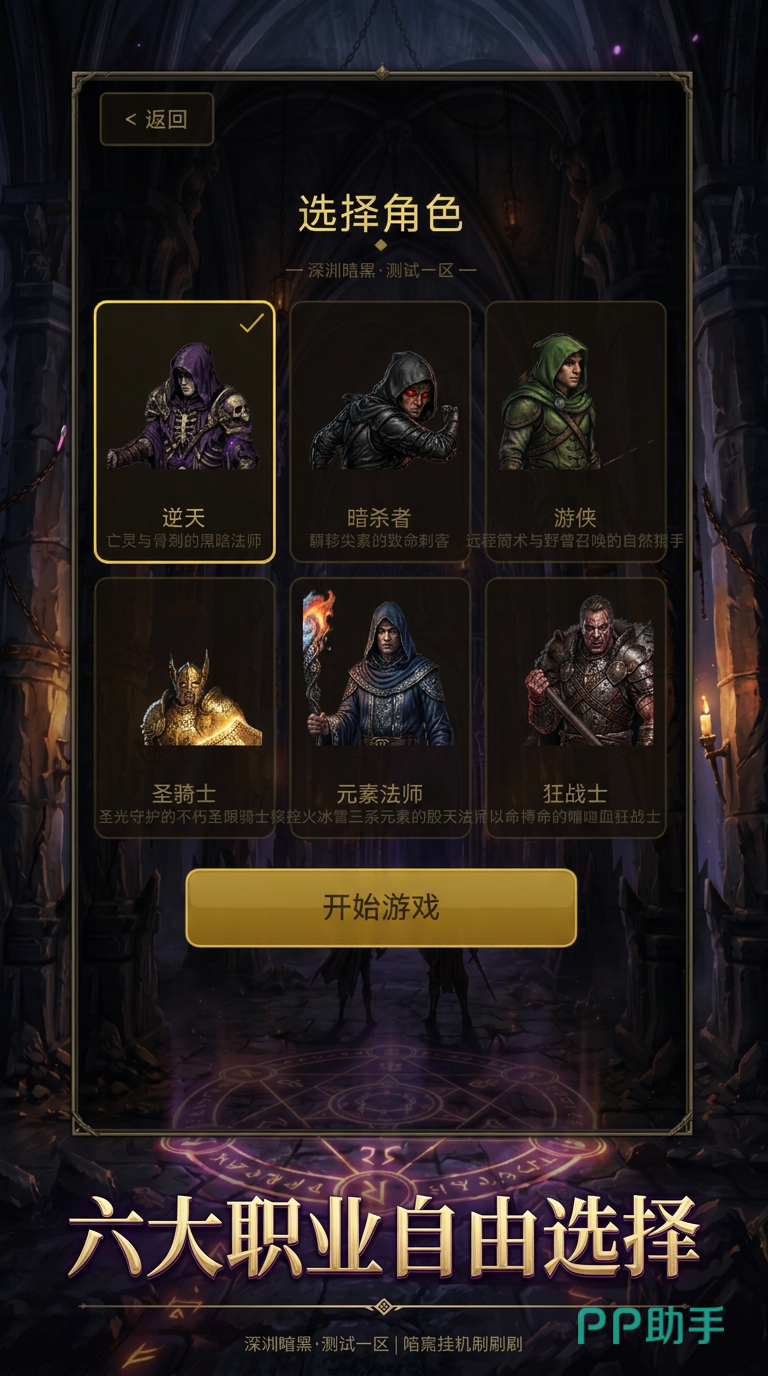 区别于传统暗黑类游戏对操作精度与反应速度的依赖,本作通过全链路自动化设计重构玩法范式:从进入副本、锁定目标、释放技能,到自动拾取战利品、识别装备词条、触发熔炼与升星,全部由后台AI逻辑实时运算完成。职业体系方面,提供狂战士、影刃、圣骑士、元素使四大初始职业,各具独立技能树与流派分支。例如狂战士以高爆发近战见长,拥有冲锋突进、范围震击与怒气连斩等标志性能力,配合挂机智能施放逻辑,可在无干预状态下稳定输出并高效清场。