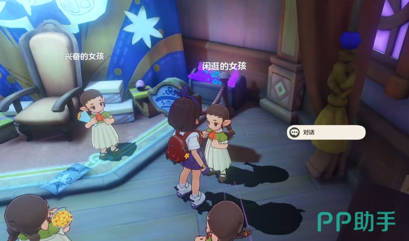 首段区域呈现四名手持鲜花的小女孩形象。其中仅有一人未持花束,与其对话后,伪装者现出原形并触发战斗。击败或收服该精灵后,将掉落小夜精灵蛋。在该区域地面及周边可拾取高级咕噜球与魔法石;另有一颗蓝色眠星悬浮于高背椅子正上方,需注意抬头查找。