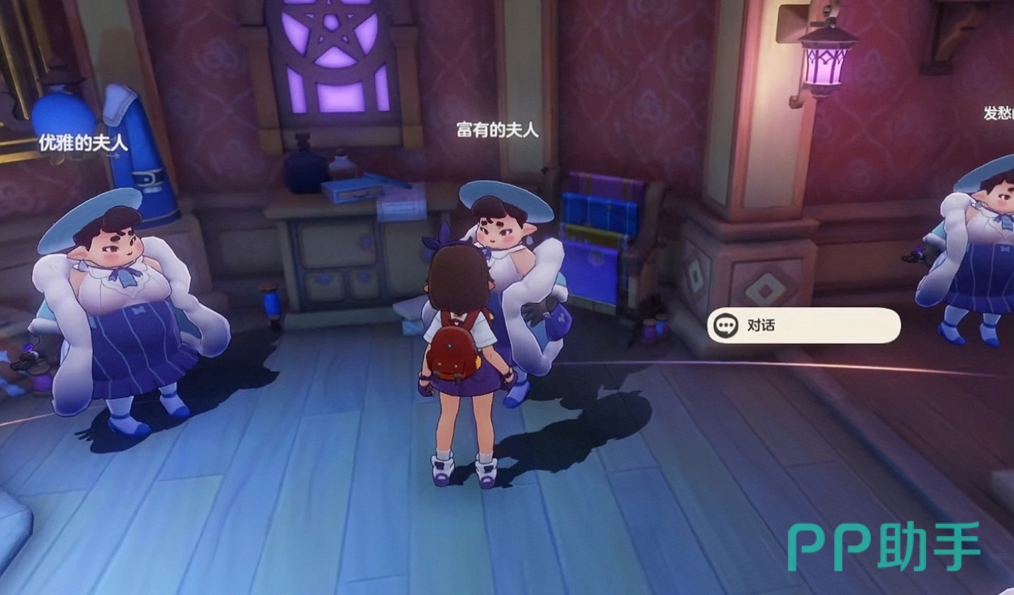 第二区域出现多位身着相似服饰的女性角色。此处需通过细节比对找出异常者。角落处藏有2枚魔法石;黄棕色矮柜子具备可移动特性,首次移动后可获得3枚游戏币;继续前行,再次移动同款矮柜,即可进入内侧空间,在其角落拾取1枚普通咕噜球。随后与“热爱艺术的夫人”交谈,她会提示关键线索:所有人物服饰均绣有蝴蝶纹样,唯独伪装者衣饰上缺失该图案。确认身份后触发战斗,对手为小夜的完全体形态——朔夜伊芙。需特别注意:若未能首回合击败,其将发动“隐藏条款”技能,强制交换我方精灵与自身当前所用技能。胜利后,场景中央将生成1个超级华丽宝箱。