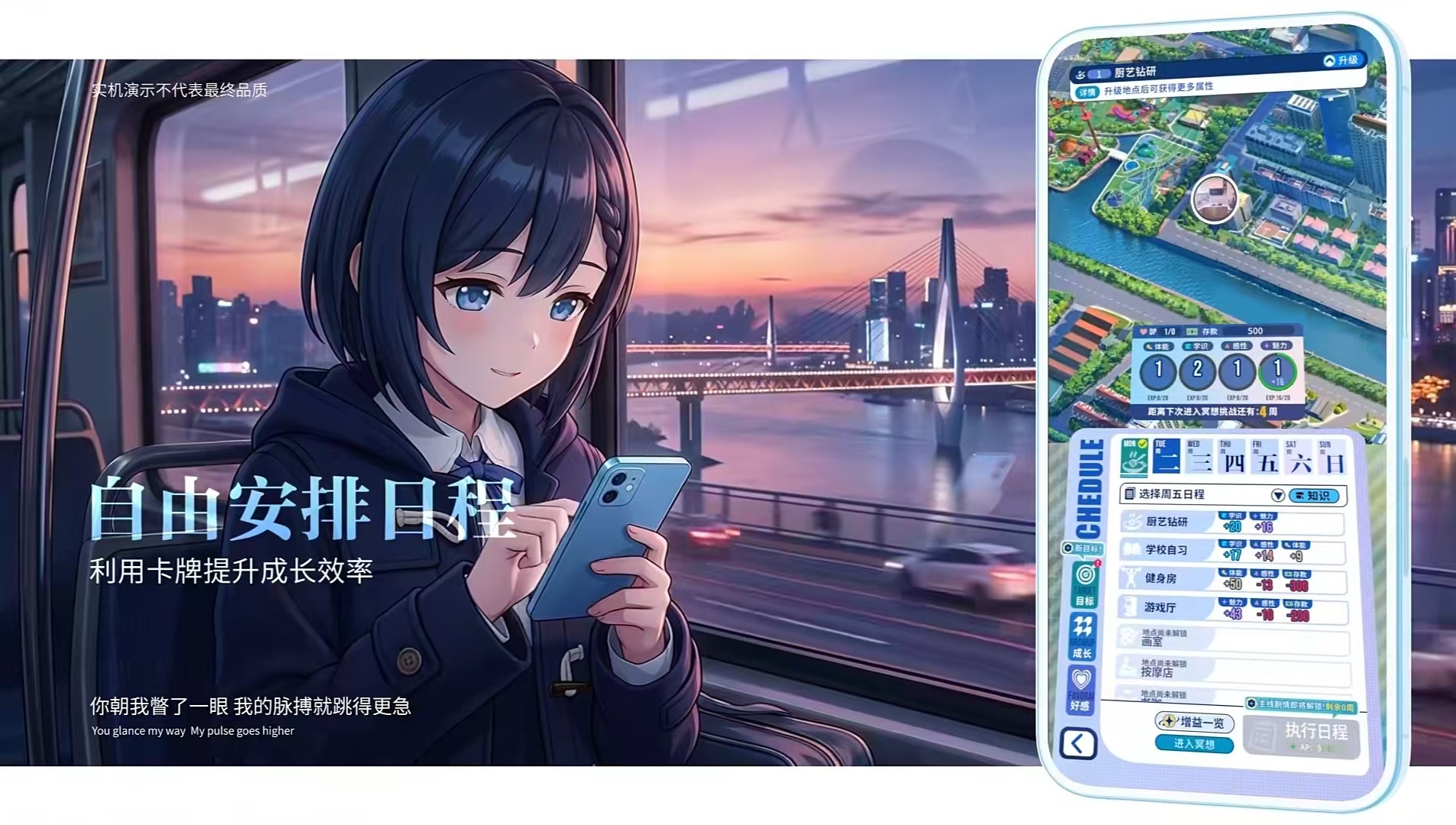 本作融合卡牌策略、Roguelike随机机制与生活模拟三大核心玩法,构建出兼具成长性与重复可玩性的独特体验。日常行为如晨间散步、课堂互动、四季三餐等均被设计为可触发的卡牌增益事件,而角色亲手制作的便当等生活化元素亦能转化为战斗属性加成。所有剧情推进均依托于多线叙事副本系统,玩家将在主线校园场景之外,自由穿梭至中世纪贵族庄园、古代科举赴京路途等跨时空世界,每个副本拥有独立世界观、差异化任务逻辑与不可复用的专属剧情分支。