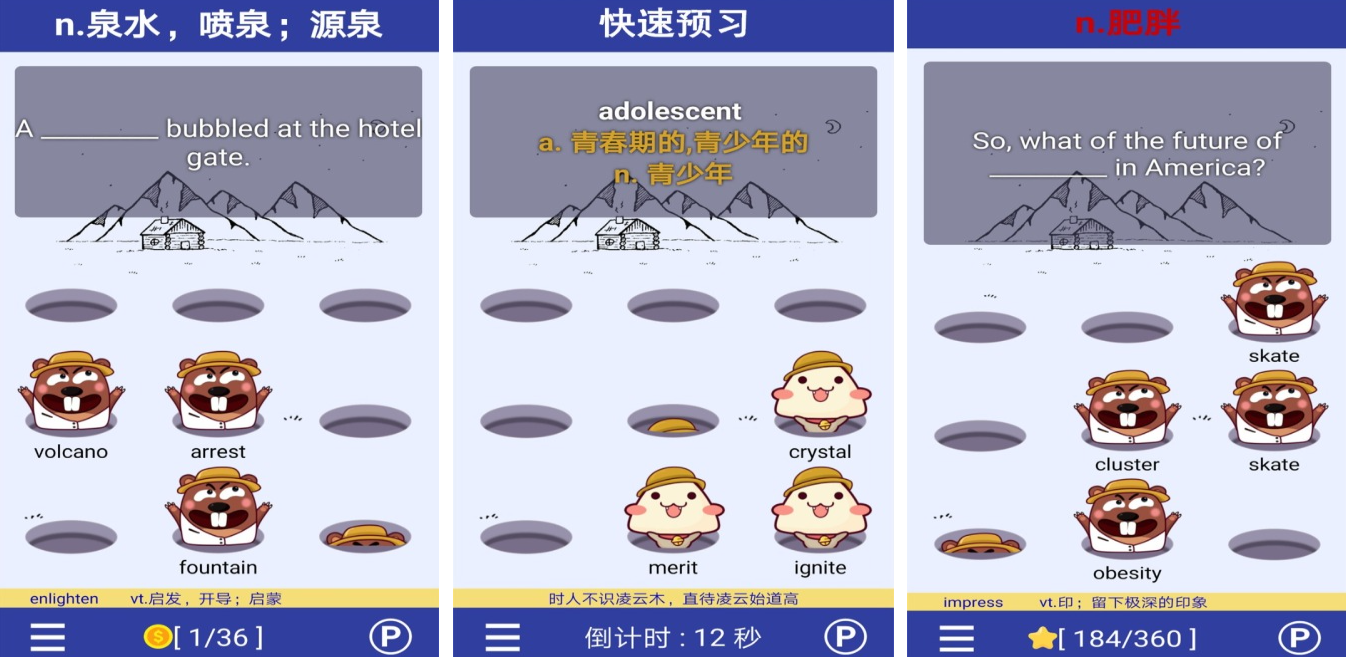 以打击地鼠为核心玩法,每个冒出的地鼠头顶显示一个待学单词,玩家需快速识别并点击对应词汇。结合视觉联想技术,增强记忆留存率。每天仅需投入20分钟即可完成大量词汇复习。生动的角色动画与流畅界面设计显著提升学习兴趣,帮助用户在轻松氛围中掌握单词用法与含义。