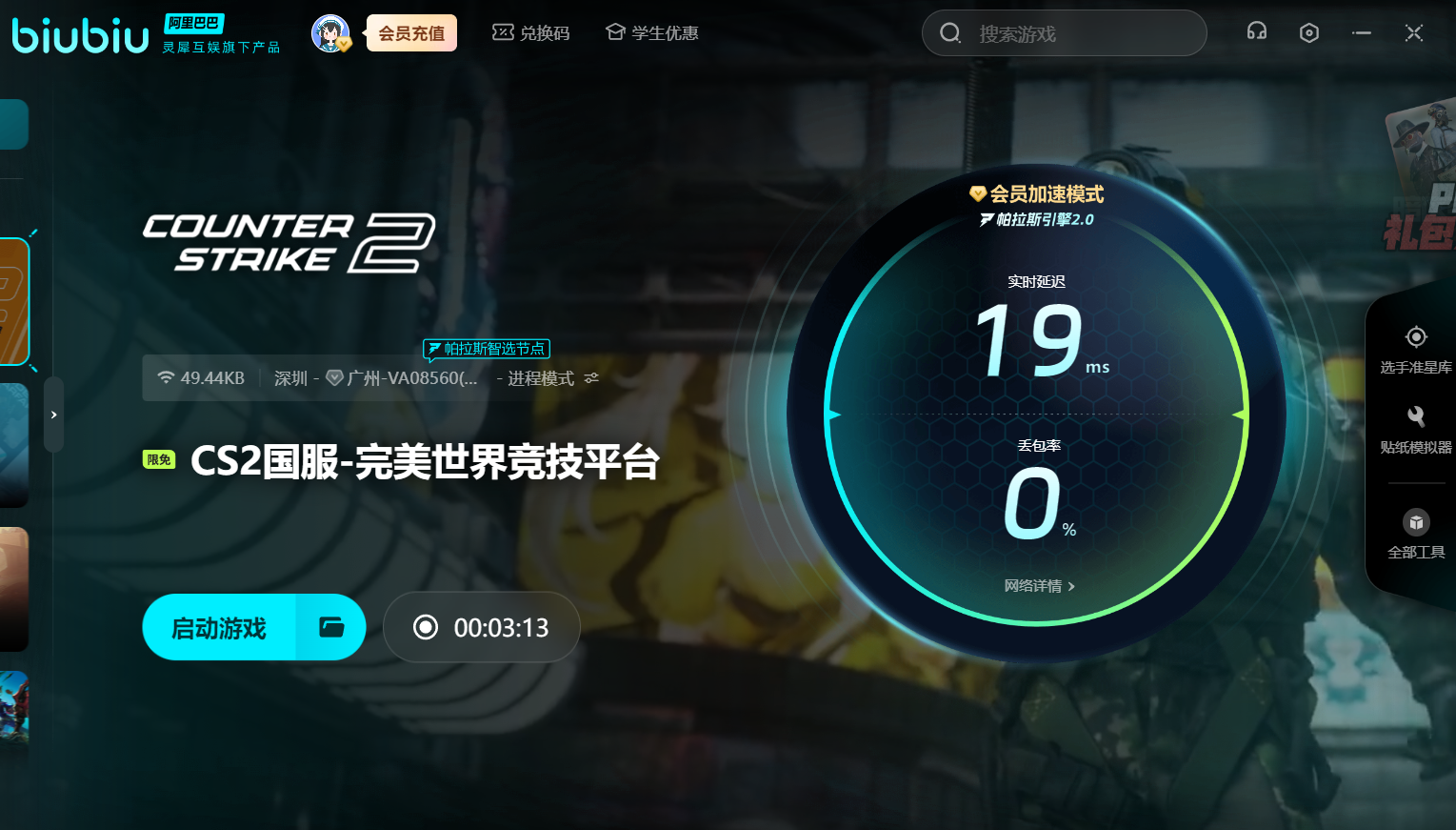 biubiu加速器的福利更是诚意满满!现在新用户注册即可免费领取24小时加速时长,无压力体验流畅对战;输入【biubiu不卡顿】的兑换码,新老用户们还能额外获得三天加速体验时间,足够你在战场上尽情挥洒汗水!登录平台后,简洁直观的界面一目了然,搜索栏中输入搜“CS2”,一键点击加速,轻松开启。