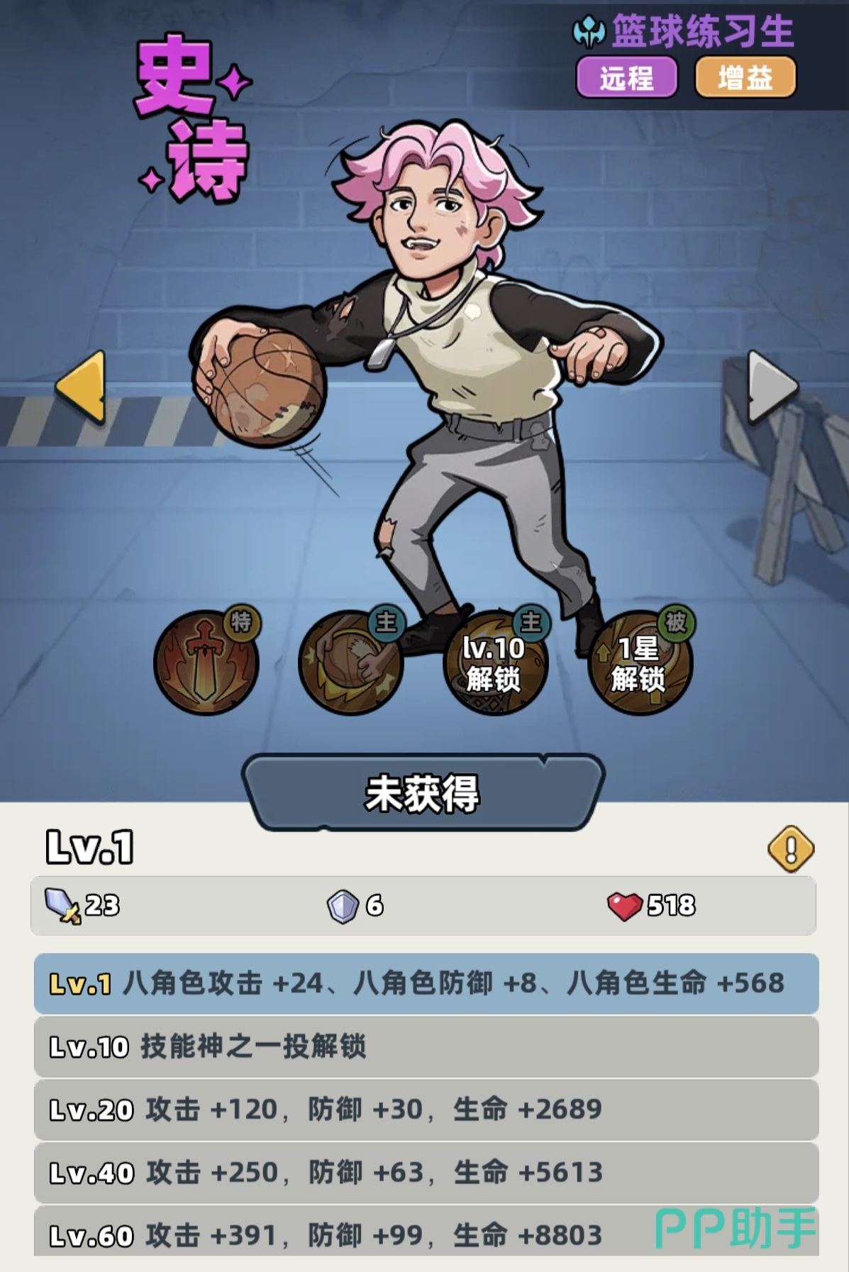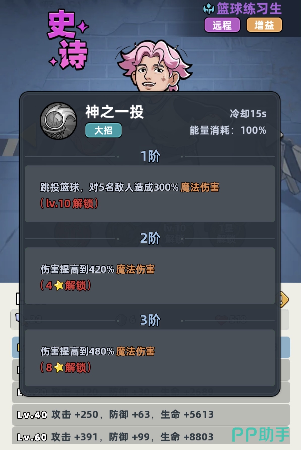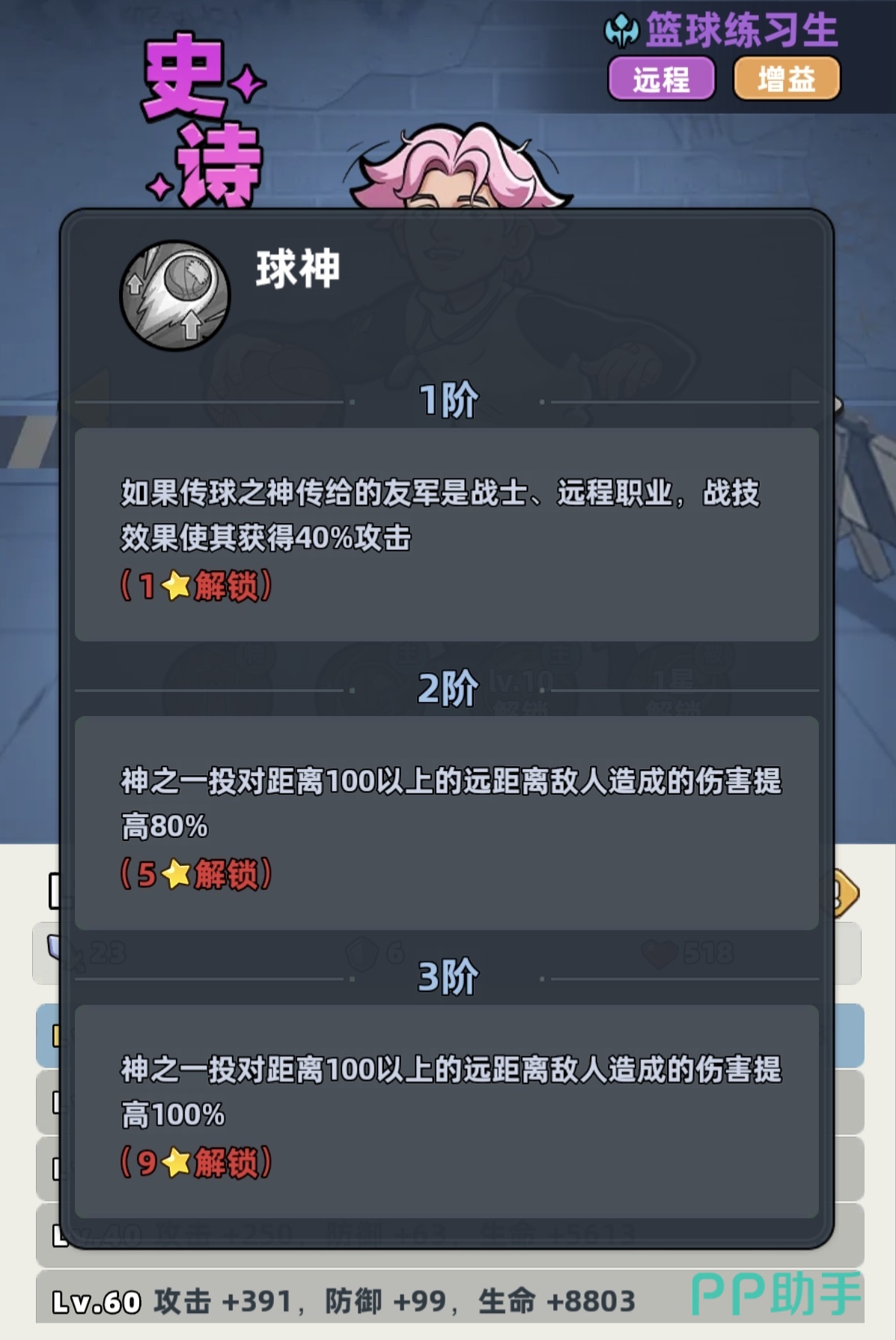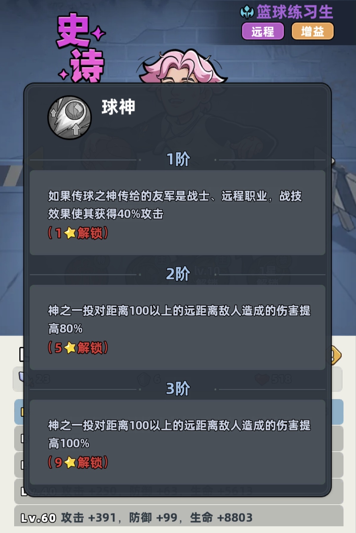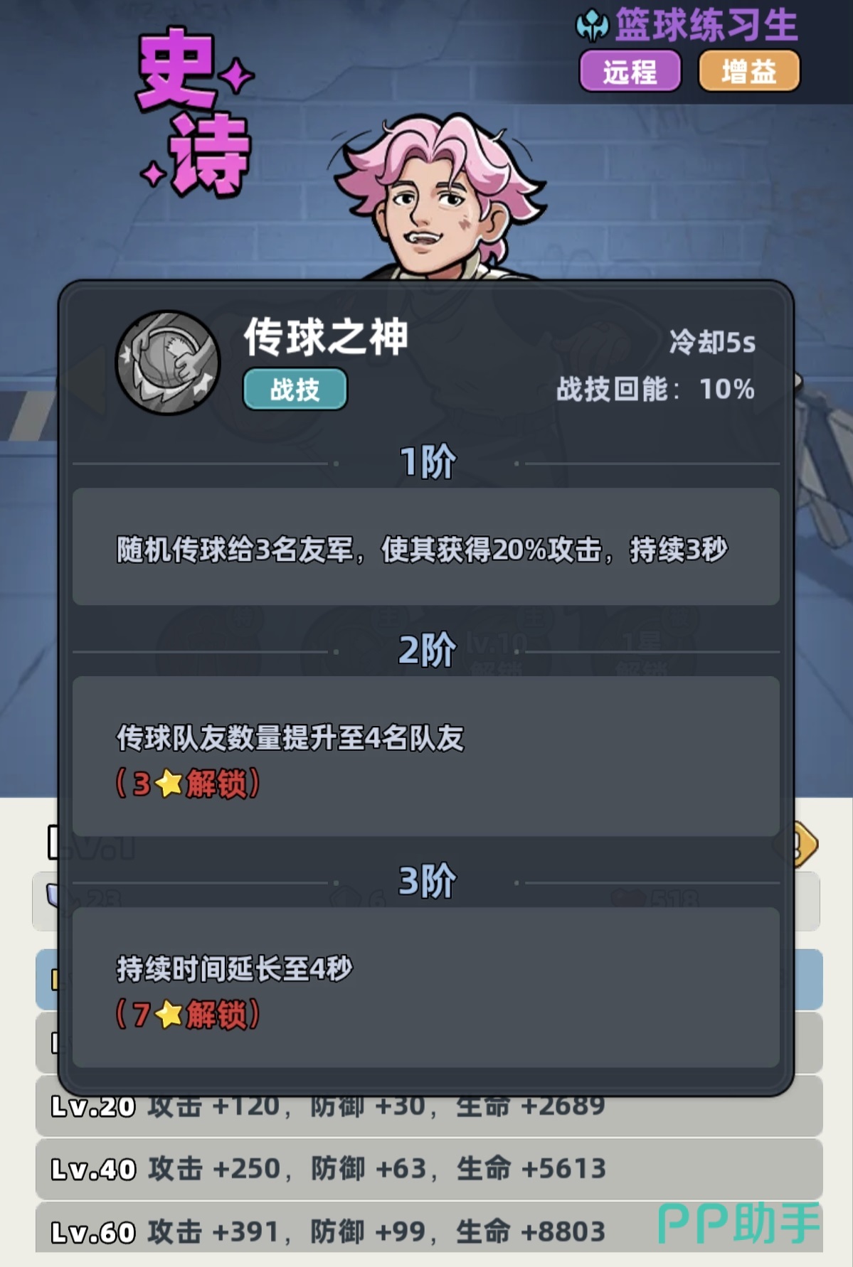 尽管篮球练习生仅拥有史诗品质,但其职业特性明确标注为“所有伤害提升25%”,且属于远程输出型单位。这一基础属性已显著优于多数同品质角色。更关键的是,其技能组设计高度契合前期开荒节奏:战技可随机向三名友方单位传递篮球,赋予其攻击加成;随技能等级提升,传球目标数增加、增益持续时间延长,冷却仅为5秒,意味着全队约20%的攻击加成可实现高频覆盖。大招“跳投篮球”为范围伤害技能,等级提升后伤害增幅显著,是当前版本前期群体清怪效率最高的AOE手段之一。被动效果进一步强化协同性——当传球对象为战士或远程职业时,攻击加成额外提升;同时,大招对远距离敌人造成伤害时享有额外倍率加成。综合来看,该角色虽无神话稀有度,却凭借机制深度与数值扎实度,成为少有的可持续使用至中期的核心战力。