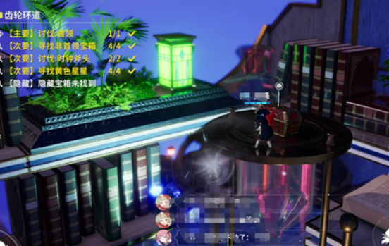 除了箱子之外还需要收集星星,一般这些星星都会在箱子的附近出现,首先玩家需要进入到齿轮环道,在环岛这里可以直接看到一个木箱,沿着齿轮环道继续向前就能看到一个发光的星星,接下来沿着这个齿轮环道继续向右行走,在下一个齿轮圆盘上就能找到第二个箱子,然后可以在这里左右查看,一般在箱子附近都会看到第二个星星。