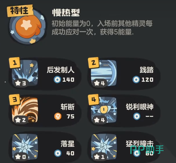 该精灵携带“慢热”特性,这是一个具有一定局限性的被动效果。当动力猿首次登场时,能量值为零。虽然每次成功应对对手行动可获得5点能量,但在实战中触发应对条件并不容易,因此经常出现入场后无技能可用的情况。