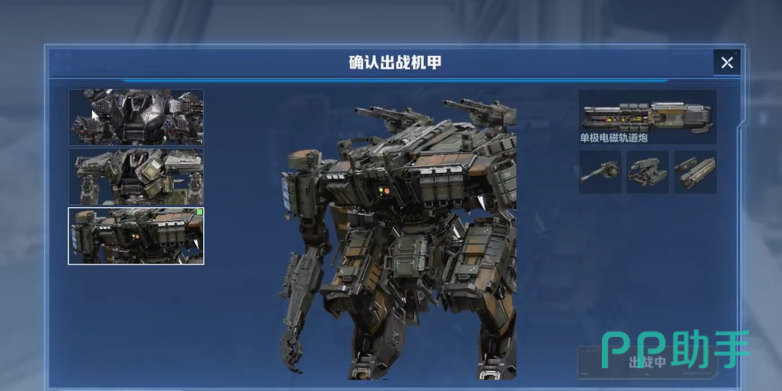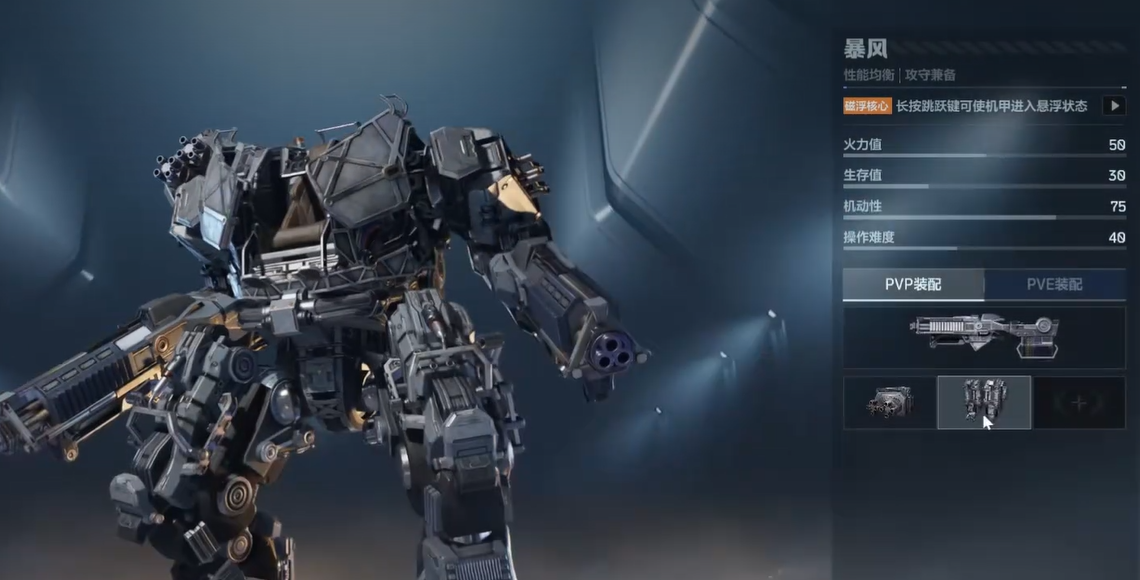 机甲战力并非仅由本体决定,配件组合才是差异化构建的核心。配置界面右侧明确区分PVP与PVE两套独立装配方案,二者不可混用。配件体系分为四大类:主武器、战术挂件、辅助挂件及专属挂件。以暴风机甲为例,其主武器支持三类适配:步枪单发伤害最高但射速偏低;冲锋枪射速领先但单发输出较弱;机枪则在两者间取得平衡。玩家应依据自身操作习惯与战场定位进行取舍。