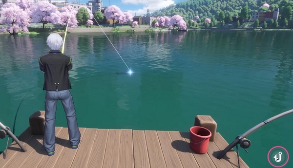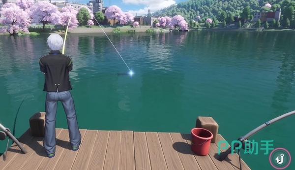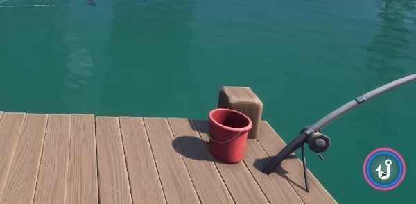 玩家可在地图中任意大型水域边缘发现固定垂钓点——通常配有木质水桶与立式钓竿模型。靠近后触发交互提示,点击即可进入钓鱼准备阶段,手动完成抛竿动作。