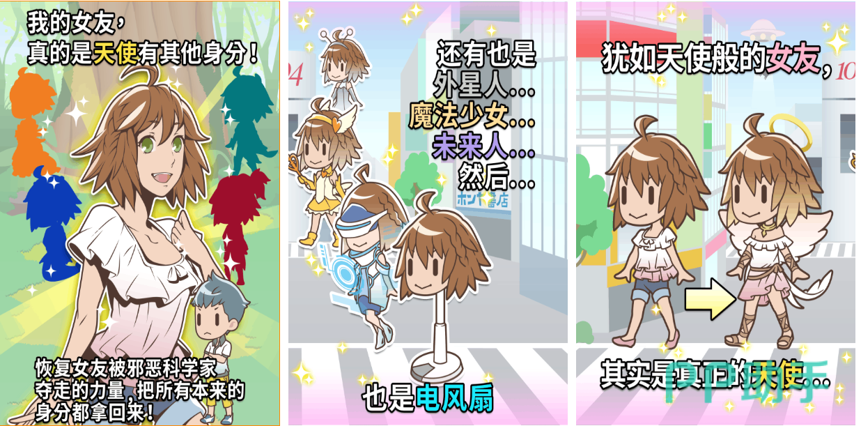 与天使谈恋爱是一种什么样的体验呢!在本作中玩家有机会跟可爱的天使女友进行恋爱,恋爱互动任务众多给人真实谈恋爱快感,游戏画风动漫呆萌有一种特殊的番剧式感觉,天使般的女友性格温柔也有着绝佳的容颜,极为真实的交互恋爱快感也令男生们回味无穷,你如果拥有天使女友会不会感觉很幸福?