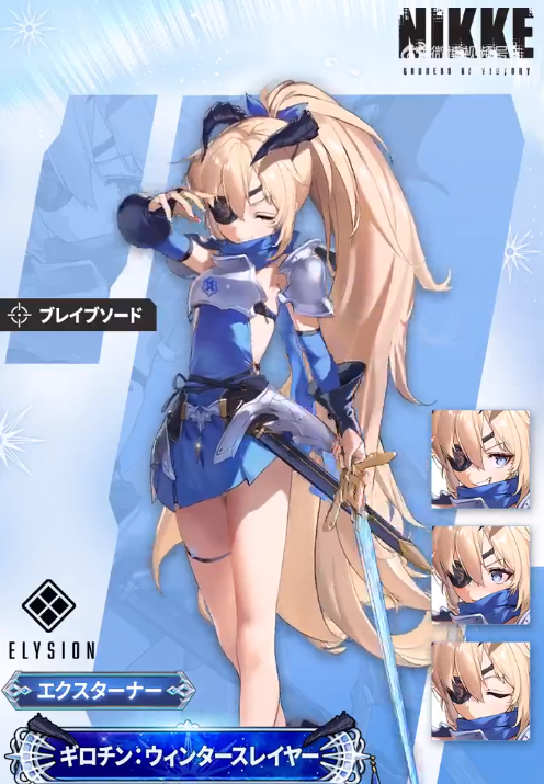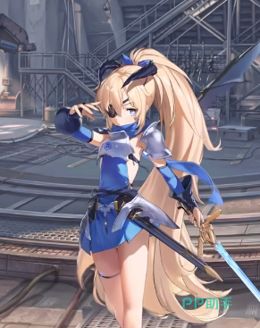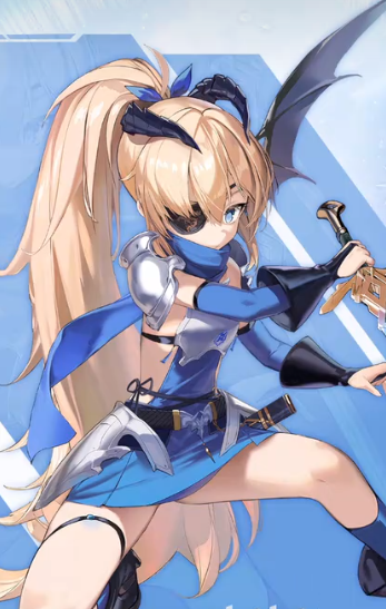 角色是一个留着金色马尾的女生,经常会穿着深浅两种蓝色搭配的服装,蓝色的瞳孔加上忧郁的眼神,会看起来让角色很有距离感,头上深色的触角加上眼罩,会更加增添角色的冰冷感,这是一个主打火力型的角色,在战斗的时候会使用步枪攻击。