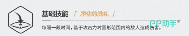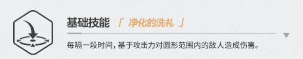 一技能「净化的洗礼」为周期性圆形范围伤害,伤害量依攻击力计算。该技能不具备主力清场能力,但在多目标场景下可提供稳定的AOE补刀效果,对敌方站位形成一定牵制,属于功能性辅助输出手段。