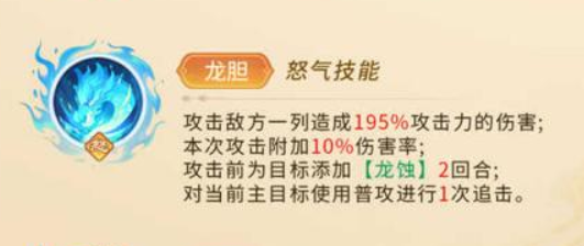 赵云的核心输出依赖怒气技能“龙胆”,该技能以一列敌人为目标,造成高达195%的物理伤害,并附带10%的基础额外伤害概率。在释放前,技能会为目标施加“龙蚀”状态,持续两回合;若在此期间对主目标进行普攻,还可额外触发一次随机追击,形成连锁打击。配合专武与天赋叠加,整体输出链更加流畅且具备不可预测性。