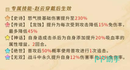当龙胆亮银枪达到绝世品质时,赵云的普通攻击将有50%几率额外发动一次追击,显著提高连击频率与输出节奏。而最终进阶至无双品质后,将解锁永久性增益:伤害率与免伤率均在原有基础上提升12%,实现攻防两端的全面进化。除了专武带来的质变外,技能体系同样是决定其战场定位的重要因素。