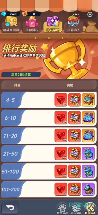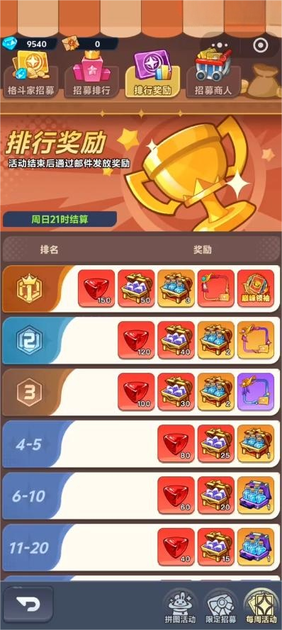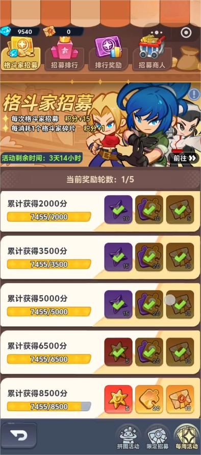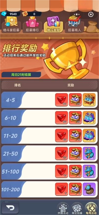 除常规招募界面外,每周限时活动面板是重要福利来源。在该界面可直接领取格斗家专属招募次数及碎片,同时同步查看全服实时战力榜单。榜单奖励按区间划分:排名第100至200名的玩家可稳定获得基础培养资源——如强化石等固定道具,虽单次数量有限,但属可持续获取的稳定收益。