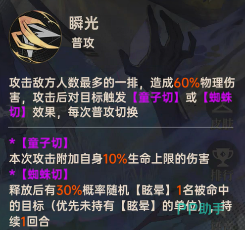 普攻设计具备明确的战术指向性:默认锁定敌方单位数量最多的一横排发动攻击,并在「童子切」与「蜘蛛切」两种模式间轮替。其中,童子切提供额外伤害加成;蜘蛛切则附带30%基础概率的单体眩晕效果,且系统自动规避已处于眩晕状态的目标,确保控制资源高效分配。当角色达成超限3级后,在「王权」状态下,普攻有50%概率同步触发双重效果——即同时造成额外伤害并施加眩晕,显著提升单次行动的综合压制力。