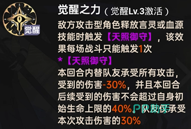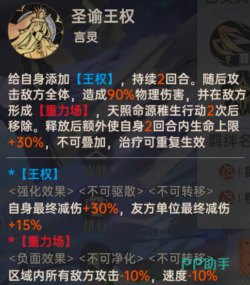 主动技能「圣谕王权」是整套循环的启动枢纽。释放后立即赋予自身持续2回合的「王权」状态:期间自身减伤率提升30%,全体友方单位获得15%减伤增益;同时对全体敌人造成伤害,并在敌方阵营生成「重力场」——该领域使范围内所有敌方单位攻击与速度降低10%。此外,技能还将为天照命额外增加30%最大生命值(不可叠加),但治疗效果可重复生效,大幅强化其战场持续作战能力。重力场持续时间等同于天照命行动2次,实际覆盖约3–4个敌方回合,形成稳定软控窗口。