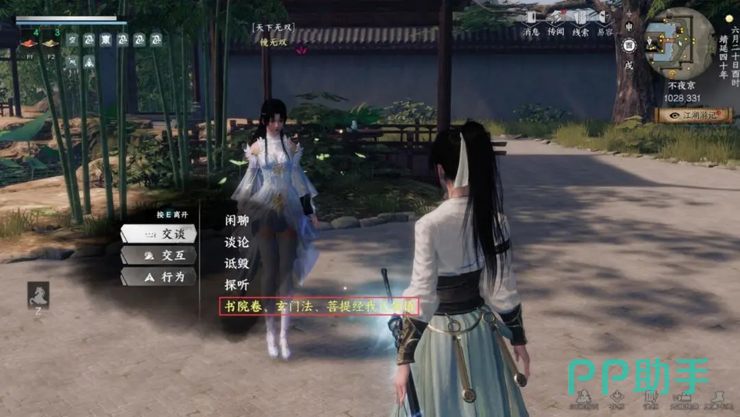 当三本典籍全部收集完毕后,务必逐一学习并完全领悟其中内容。随后前往不夜京寻找镜无双,此时她的头像旁会出现奇遇提示图标。与其对话后选择已领悟全部三本典籍的选项,便会进入切磋环节。这场对决难度较高,建议提前调整装备与内功配置,确保具备足够的实力应对挑战。成功击败她之后,镜无双便会正式加入队伍,成为可操控角色。
