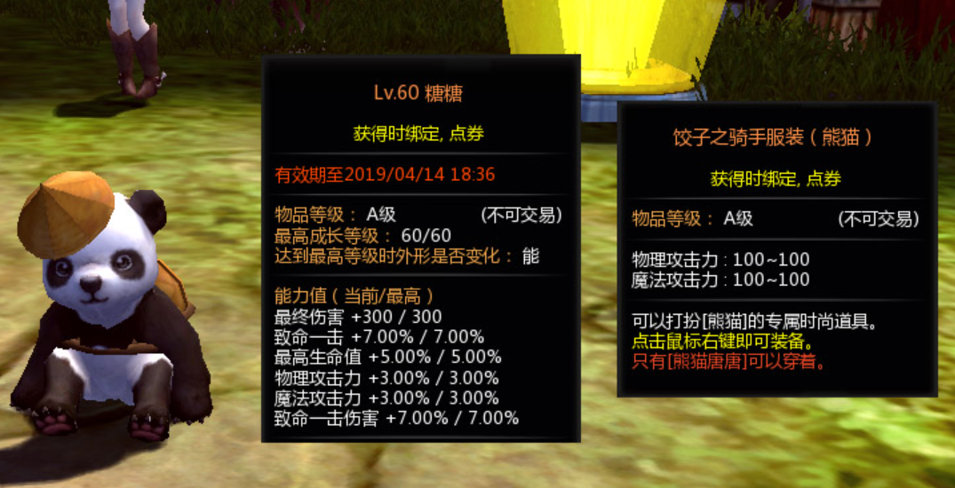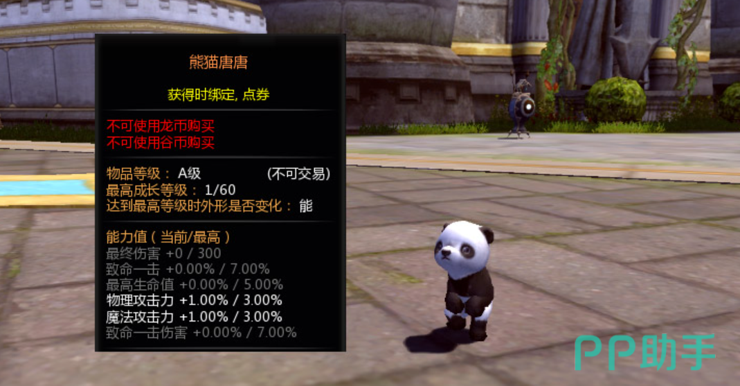 熊猫糖糖是一个特殊宠物,它的等级是金色,并且最高可以提升到六十级, 其能力值在初始状态下,附带有1%的物理攻击力加成以及1%的魔法攻击力加成,随着等级不断提升,熊猫糖糖的最终伤害数值会提升到三百点,致命一击的伤害可以达到7%。