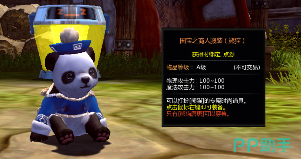 熊猫糖糖在游戏当中的外形也是可以任意玩家DIY的,玩家可以在商城之中,通过购买外观的方式,来丰盈熊猫堂堂的外形设置,熊猫糖糖的打扮效果,也会给其附加有基础攻击力,例如,当熊猫糖糖使用国宝之商人服装时,物理攻击力可以叠加到一百, 魔法攻击力可以提升到一百,这对熊猫糖糖而言是极强的战斗力提升~
