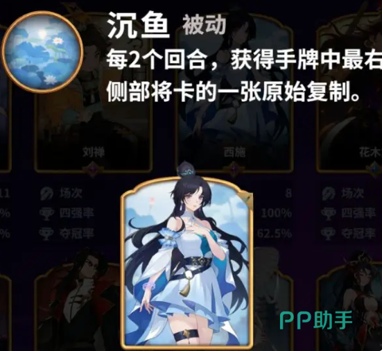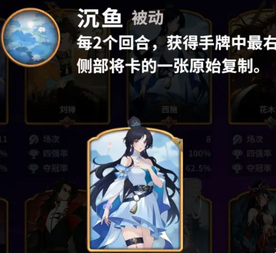 在《千机阵》手游中,西施作为统帅型武将具备极强的战术适配性与成长潜力。其核心被动“沉鱼”机制独特:每间隔两个回合(即第1、3、5回合等奇数回合),可自动获取当前手牌最右侧的一张卡,并完成该卡的原始能力复制。这一机制使她在游戏前期便能快速构建卡组优势,无需依赖高阶商店等级即可稳定获取关键资源。