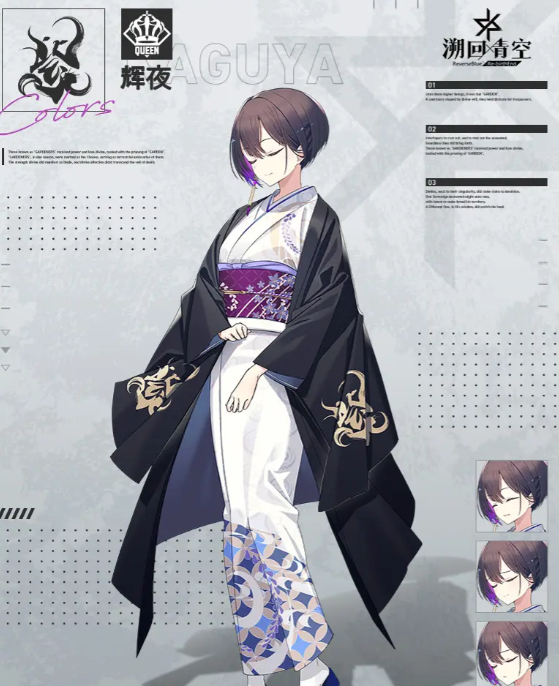 作为第二骑士团千紫的重要成员,辉夜是顶尖的咒术研究专家,常代替极少现身的KING掌控者千紫处理事务,在团队中扮演着核心智囊的角色。