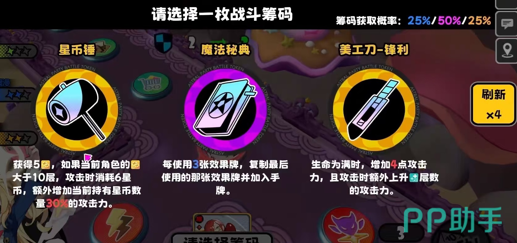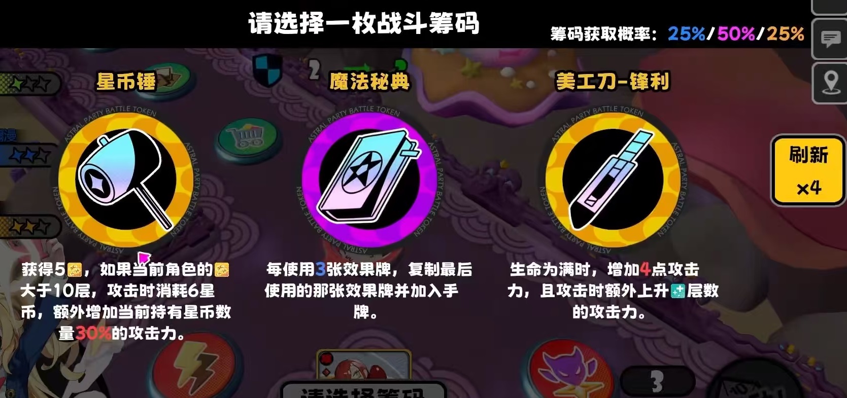 筹码获取共有三大稳定途径:其一为筹码商店——踩中地图上标记的商店格子即可触发刷新,每次生成3至5枚可选筹码,消耗星币可主动重置货架,单局存在获取上限,建议优先锁定契合当前流派核心机制的选项;其二为怪物掉落——精英怪与Boss均有概率掉落筹码,掉落品质与所在区域星阶正相关,高星区域紫、金品质掉落权重明显提升;其三为任务奖励——完成指定筹码类可选任务前,系统支持预览所获筹码的品质与具体类型,便于策略性接取。