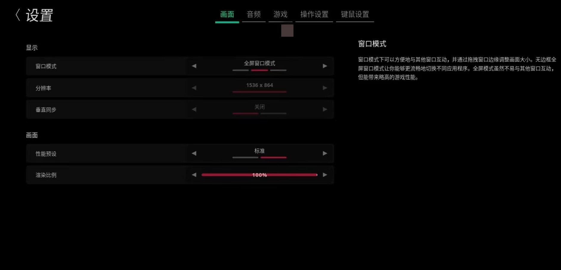 窗口模式共提供三种选择:普通窗口、无边框全屏窗口与纯全屏。普通窗口支持自由缩放与多任务切换;无边框全屏窗口兼顾沉浸感与程序切换响应速度;全屏模式则可释放更多GPU资源,小幅提升帧率稳定性。具体选择应依据个人使用习惯及外设环境决定。其余参数中,分辨率建议设为设备原生最高值;性能预设推荐选择“极致”档位;渲染比例同步调至100%或更高(如支持),以确保UI清晰度与场景细节兼备。