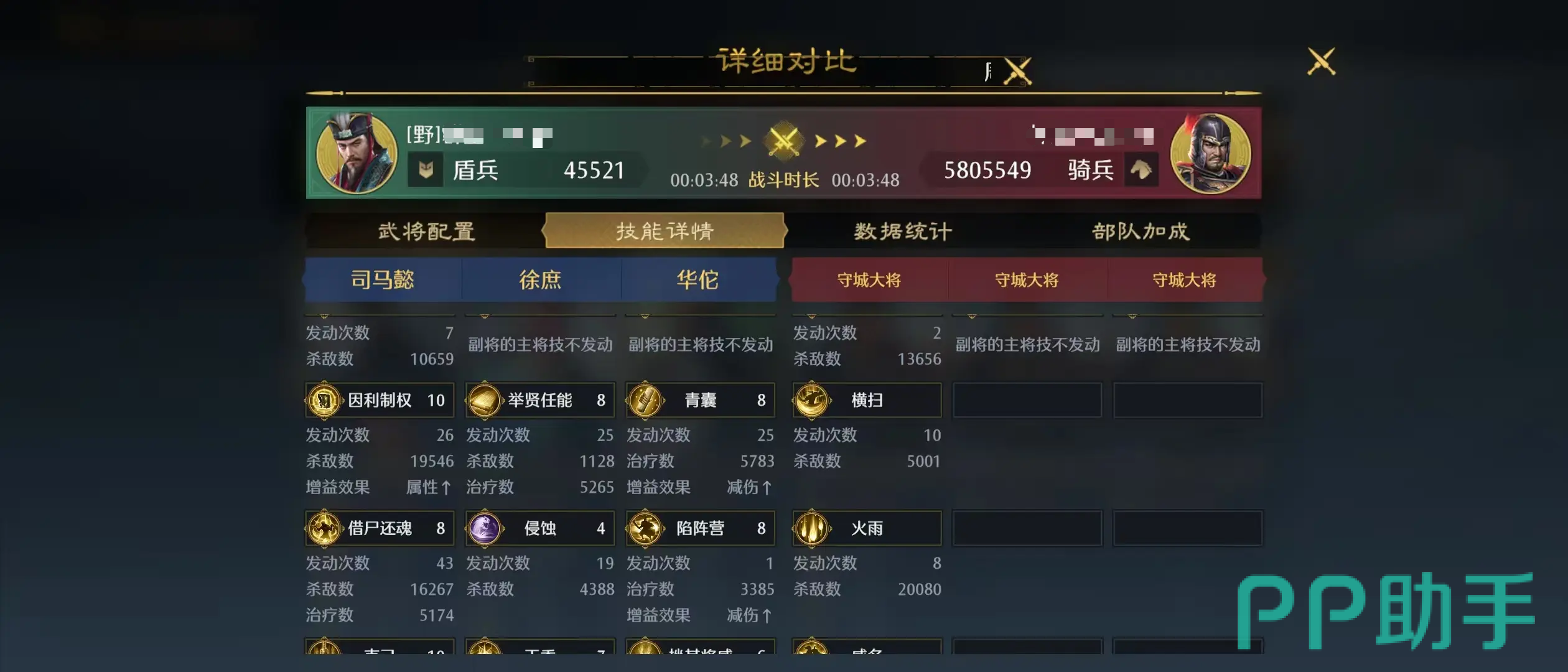 华佗则负责构筑最终层防御闭环。其治疗量在同类辅助中属于顶尖梯队,不仅能覆盖前排承伤压力,更能通过【驱散】效果清除敌方施加的控制类状态(如眩晕、禁疗、缴械等)及减益效果(如虚弱、禁策),确保司马懿与徐庶始终处于可释放战法的理想状态,避免关键回合失效,大幅提升整支队伍的战术执行连贯性。