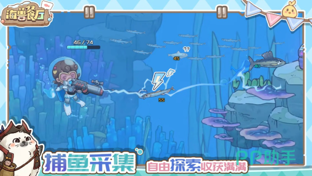 特定装饰组合可触发专属效果,不仅提升客流量,还能增加顾客的额外消费,进一步拉高餐厅收入,菜品研发是提升餐厅竞争力的核心环节,而研发的前提是获取各类食材,这就需要玩家深入海域探险,海域探险的核心操作是潜水捕鱼,玩家操控角色搭乘潜艇前往不同海域,下潜后需通过屏幕滑动调整角色位置,点击屏幕发射鱼叉捕获鱼类,过程中需时刻关注角色头顶的氧气值,氧气随时间消耗,当数值过低时需点击上浮按钮返回潜艇,否则会导致探险失败,损失部分已捕获的食材。