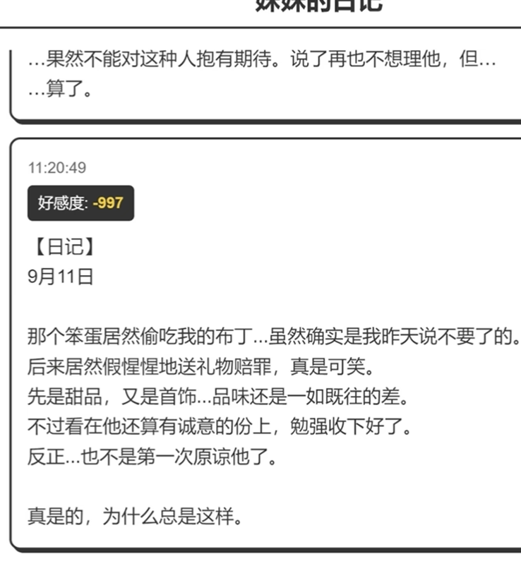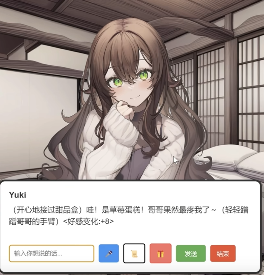 好感度数值模型严格遵循正负双向规则:正确匹配礼物类型可获得稳定增幅,其中甜品+4点、书籍+3点;错误选择如赠送“五年高考三年模拟”则直接扣除4点。持续重复投喂同一类礼物,将推动Yuki性格向傲娇或病娇方向演化,形成个性化成长轨迹。所有赠礼记录同步写入Yuki日记模块,实时呈现好感值变化曲线与对应互动事件,支持全程回溯与策略复盘。