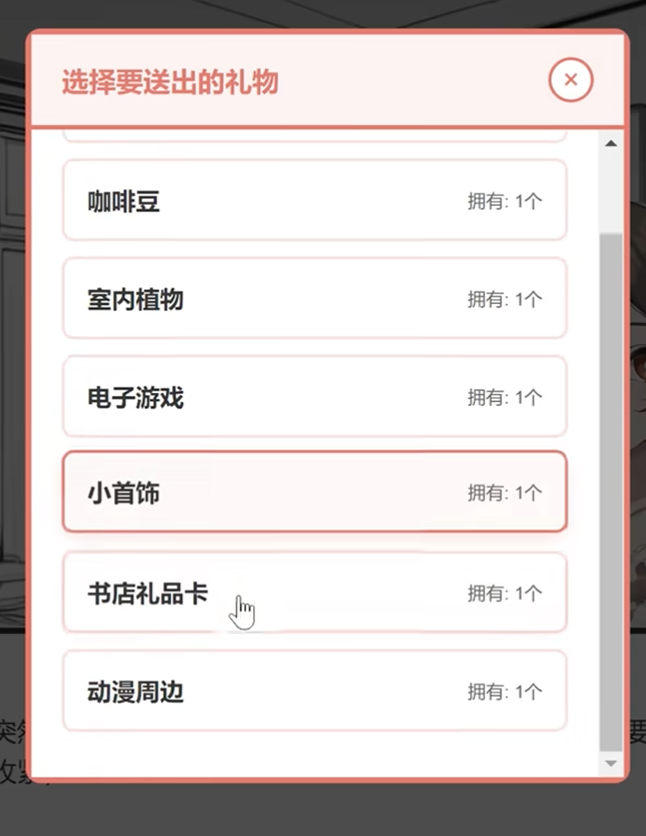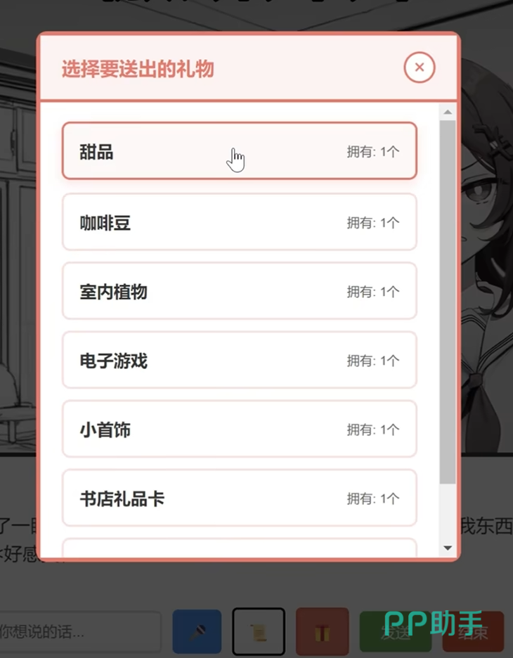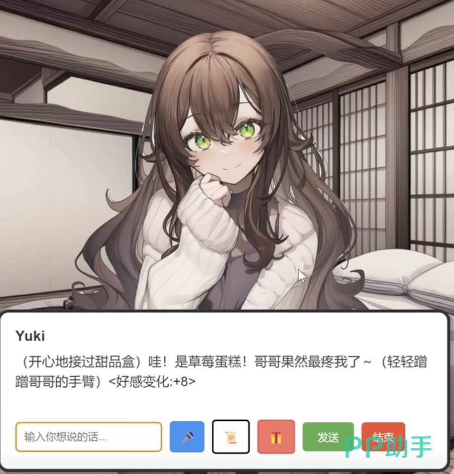 礼物体系划分为三大层级:基础型、情境增益型与AI智能推荐型。基础礼物涵盖巧克力、书籍、甜品、咖啡豆、室内植物、小首饰、书店礼品卡、动漫周边等常规品类,每类对应固定好感度加成数值,需结合Yuki当前心情状态与日常行为倾向动态选择。情境增益礼物则依赖时空条件触发特殊反馈——例如清晨赠送草莓蛋糕可提升亲密度,雨天递上雨伞将激活限定语音;性格维度亦构成重要筛选依据:傲娇型Yuki对甜品响应强烈,可爱型Yuki则更易被小首饰打动,误选将导致好感度反向波动。