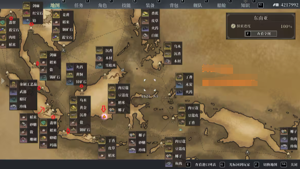 西非港口依托丰富矿产与珍稀动植物资源形成独特供给结构:黄金、钻石、象牙为战略级硬通货;紫檀木、乌木属高等级造船与装饰材料;椰子、砂糖、珊瑚满足基础补给与转口需求;龙延香、乳香作为香料体系重要组成,具备高溢价空间;玛瑙、祖母绿则稳定充当流通结算媒介。印度洋沿岸呈现东西融合特征:印度印花布、棉布、蚕丝构成纺织品主力;胡椒、肉桂、紫檀木延续香料黄金三角定位;同步不可遗漏红宝石、蓝宝石、珍珠三大高价值矿物类交易品,其稀缺性直接关联后期商会评级与港口声望提升。