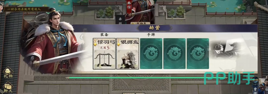 第32关:此关操作较为简单,选择吕雉作为主将。官方建议使用调兵遣将,从刘邦处借取惊羽弓装备后,本回合首次使用的杀具备强制命中效果,可直接击杀韩信完成任务。若缺少调兵遣将,则可通过破阵卸甲配合其他手段,先移除对方两张闪,再打出杀实现通关。