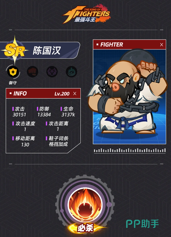 《最强斗王》是一款深度还原拳皇世界观的卡通风格格斗对战手游,融合经典角色重塑与现代化操作手感。游戏中不仅复刻了大量人气格斗家,更在角色建模、动作逻辑与技能机制上进行了精细化适配,显著提升连招流畅度与实战响应速度。本文将聚焦高人气前排核心——陈国汉,详解其技能机制、实战定位及高胜率阵容搭配策略,助力玩