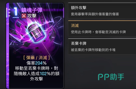 她的关键技能“悲叹回声”可造成140%的基础伤害,并为主要机制提供启动条件——即生成镇魂子弹。当触发“灵光一闪”状态后,系统将额外生成两张镇魂子弹,并将伤害提升至250%。第4张镇魂子弹会转化为技能卡,第5张则进入强化阶段,使战斗开始时即可立即获得一枚子弹,且每回合自动补充一张。镇魂子弹作为核心资源卡,在被移除并送入墓地时,会对随机敌方单位附加相当于80%攻击力的追加伤害,有效实现二次输出触发,极大增强了连招的延续性与打击效率。