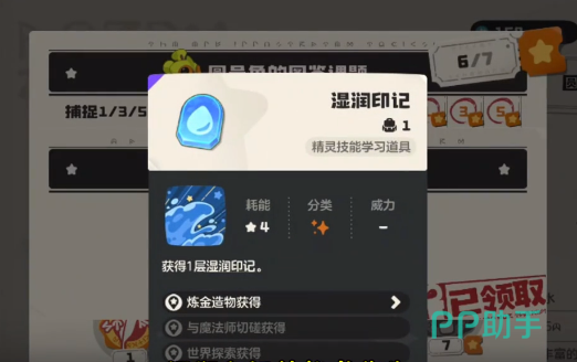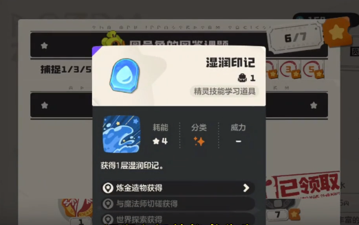 在抓捕的过程中,玩家还需要去完成第3个课题的进度,在符合条件之后就能获取湿润印记技能书。第3个课题的要求在于捕捉三种不同血脉的精灵,还需要捕捉一只了不起天分的精灵以及一只体型比较小的精灵。